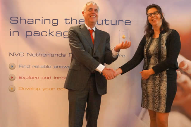 De naam van ‘s werelds meest competitieve verpakkingsinnovatiewedstrijd De Gouden Noot, is terug te zien in zijn trofee, waarin zich een massief gouden walnoot bevindt. De kick-off diende als startsignaal van de 28e editie van deze tweejaarlijkse wedstrijd. NVC Voorzitter Mevr. Christel Geerts overhandigde de unieke trofee aan de juryvoorzitter prof. Dr. Onno Omta, en wenste hem, en de gehele jury, alle wijsheid om de ultieme winnaar aan te duiden uit de veertig innovatieve verpakkingsoplossingen.